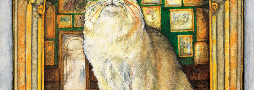 Each page finds Tom looking at a painting of a cat and reading the description on the card on the wall. The cat’s name, breed and information match a famous artist while the painting reflects their well-known style. “Jackson” is an American Wirehair named for Jackson Pollock. He is covered with splattered paint in that fantastic Pollock technique. Jackson joins Tom in the gallery as they travel from painting to painting gathering more recognisable cats along the way.