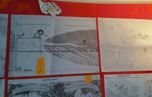 “I am trying to keep the whale’s eye out of the gutter and the tail out of the trim. I have had to crop the octopus off“ – these words from Ness Wood, the lovely book designer I worked with for “The Tale of the Whale” arrived in my inbox in the middle of the final artwork being created for this book. At the time I had the 14 and a half roughs for the book printed out large and pinned to a piece of cloth covering the whole back wall of my studio. As I completed the artwork for each one, I replaced the rough with the finished piece (printed out) – a very satisfying process, following many stages of roughs and feedback from the fabulous Scallywag team.