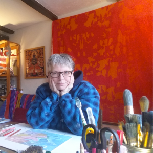 I live on my own as I’ve discovered I love solitude. However, I do feel connected with good friends, including my partner who lives with a bunch of others in a Buddhist Community. Because I live on my own (in a small-terraced cottage in a country village) I am lucky enough to be able to use my whole front room as a studio.