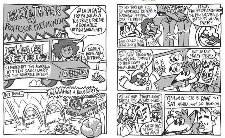 In the book, their Artist – Finn – is very much based on me as a youngster: a bit shy and wholly comics-obsessed. When bullies rip up his sketchbook, he makes the decision to stop drawing Arley and Tapper once and for all. And that same night, the duo comes to life in his bedroom. Finn must find a way to keep them hidden from all manner of bullies and baddies, and get them back home to Toon World before it’s too late. The book is packed with humour, adventure, friendship and brilliant illustrations and comic strips courtesy of the extremely ace Phil Corbett. I am super proud of it and I really hope young readers will enjoy it. More than anything, though, the ten-year-old me is jumping for joy that Arley and Tapper have finally found their way out into the wider world!
