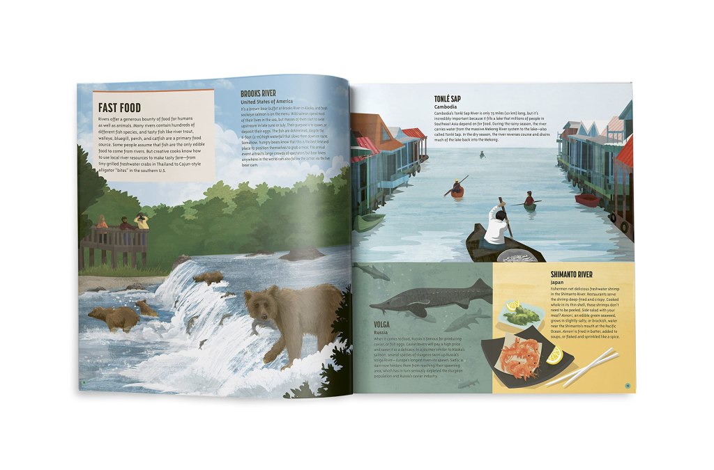 Knowing that children love nature and care passionately about their planet, I included two spreads that specifically address threats to rivers, such as pollution, climate change, overuse, and introduced species. But waterways everywhere are facing countless challenges, so I felt it necessary to establish an environmental thread that runs throughout the book. At the same time kids discover what’s awesome about rivers, they’re also reminded of threats to these precious resources.
