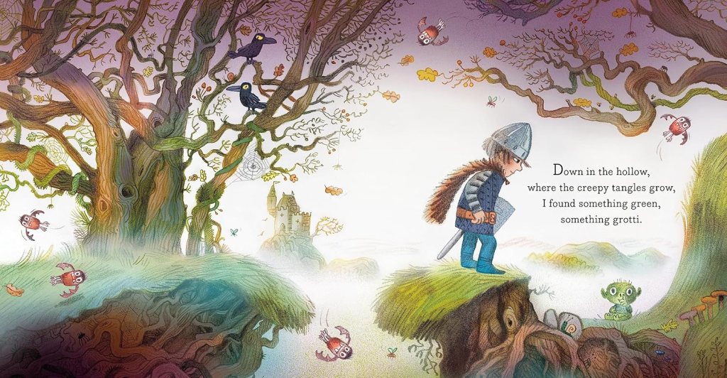 A knight was out in the forest busy doing brave things when he met a small green creature. He didn’t have time to help this grotty little thing find his way home but he just couldn’t leave him. The knight began to sacrifice items that were important to him in order to help Grotti – he found a pushchair, a way to feed him and a way to keep him warm. Finally, they found Grotti’s parents and the knight had to say goodbye. But life just wasn’t the same without Grotti and he realised he couldn’t live without him.