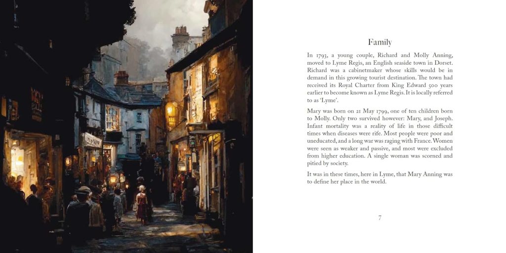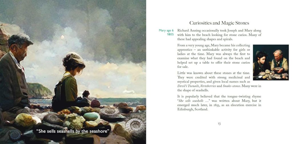She Sold Seashells reimagines Mary Anning’s image through AI technology. Author Wolfgang Grulke and the Lyme Regis Museum have researched and portrayed how she may have looked in her childhood and teen years as her passion for knowledge grew.
