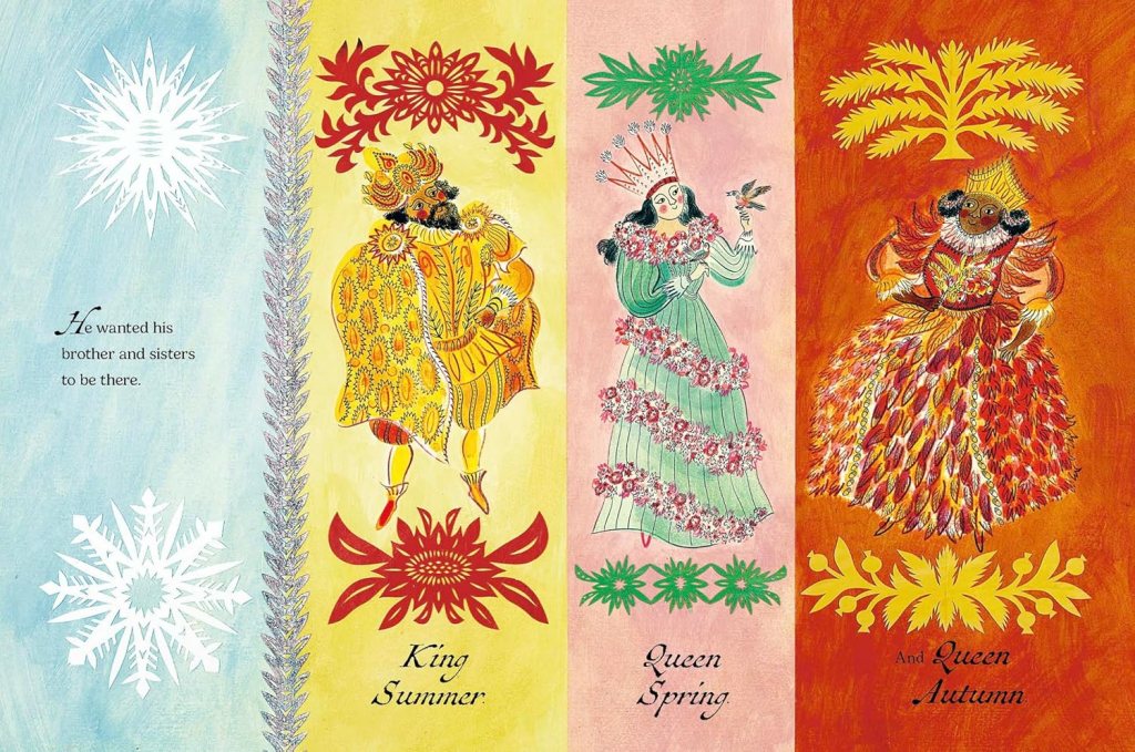 It was King Winter’s birthday and he was planning a party. More than anything, he wanted his brother and sisters to visit: Queen Spring, King Summer and Queen Autumn. Despite warnings from the sun and the winds, he brought them all together for the most gorgeous meal. But soon, the combination of summer sun, winter snow, spring growth and autumn rain caused chaos outside. Crops failed, animals became confused, towns flooded and flowers died. The land could not cope with all four seasons at once. The kings and queens realised what was happening and decided they must disperse. King Winter was left alone with precious memories of their time together. Outside, balance was restored and the world thrived.