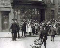 A photo from the East End in May 1915, the text says “We are Russians” to discourage looting.